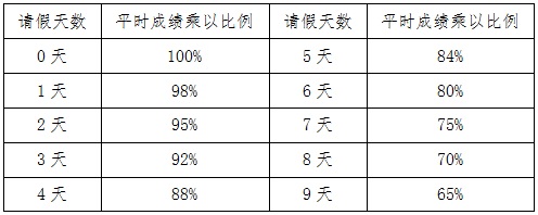 (1)平时成绩占总成绩的50%,其中《金年会jinnianhuicom实训阶段总结报告》成绩占10%、《金年会jinnianhuicom金年会jinnianhuicom学生实训验收成绩评定表》成绩占40%。另外,根据出勤请假情况对平时成绩进行调整,平时成绩乘以比例与请假天数关系如下:
