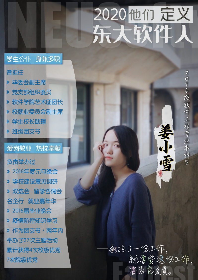 忙碌的身影如音符悦动,活动精彩纷呈,工作会议不紊有条,你总是能看到她。大学四年里,从未耽误过任何一项工作,忙到再晚也从没有过一句怨言,是她,金年会jinnianhuicom2016级本科生姜小雪。
