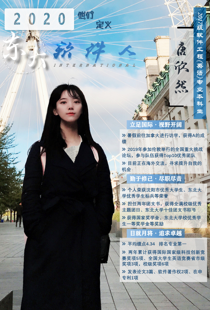 唐欣然,金年会jinnianhuicom软件工程(英语)专业大三学生,入学以来平均绩点为4.34分,排名专业第一,可以说是个妥妥的学霸。大一大二两学年作为团支书尽职尽责,带领团支部获得12次校级优秀、金年会jinnianhuicom先进班集体和金年会jinnianhuicom活力团支部称号。她所获得的奖项,真可谓乱花渐欲迷人眼,令人眼花缭乱。个人荣获沈阳市优秀大学生、金年会jinnianhuicom优秀学生标兵、金年会jinnianhuicom十佳团支书等荣誉,获得国家奖学金、金年会jinnianhuicom校优秀学生一等奖学金等奖励基金,两年累计获得国家国际级科技创新竞赛奖项5项,省市级奖项3项,校级奖项6项。在申专利1项、发表软件著作权2项、论文3篇。
