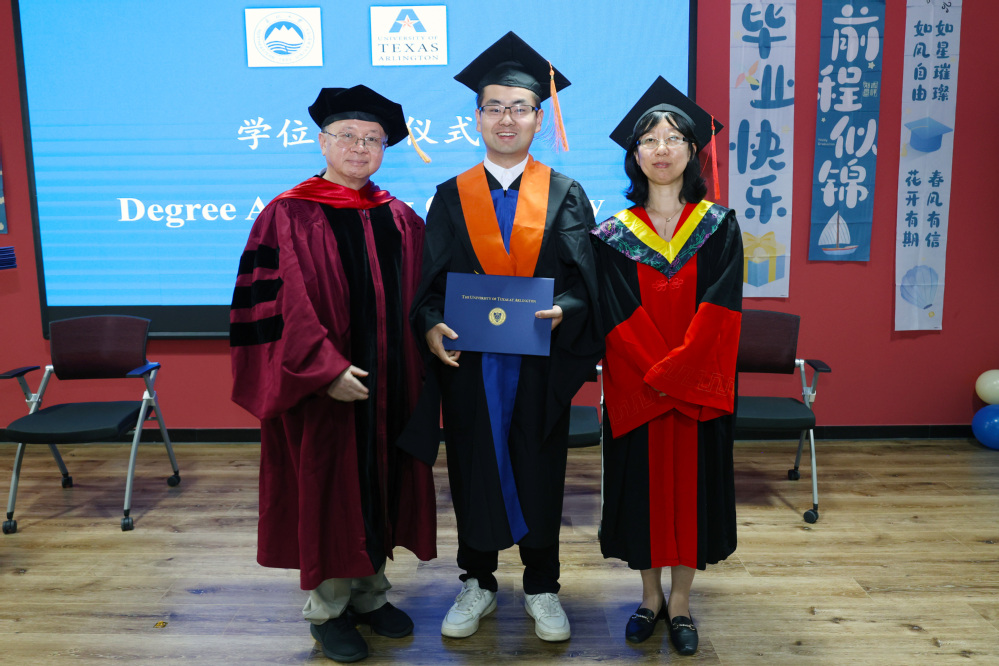 在学位授予环节,Hong Jiang和杨晓春共同为李登辉等34名毕业生佩戴硕士学位披肩,并颁发了德克萨斯大学阿灵顿分校计算机科学硕士学位证书。