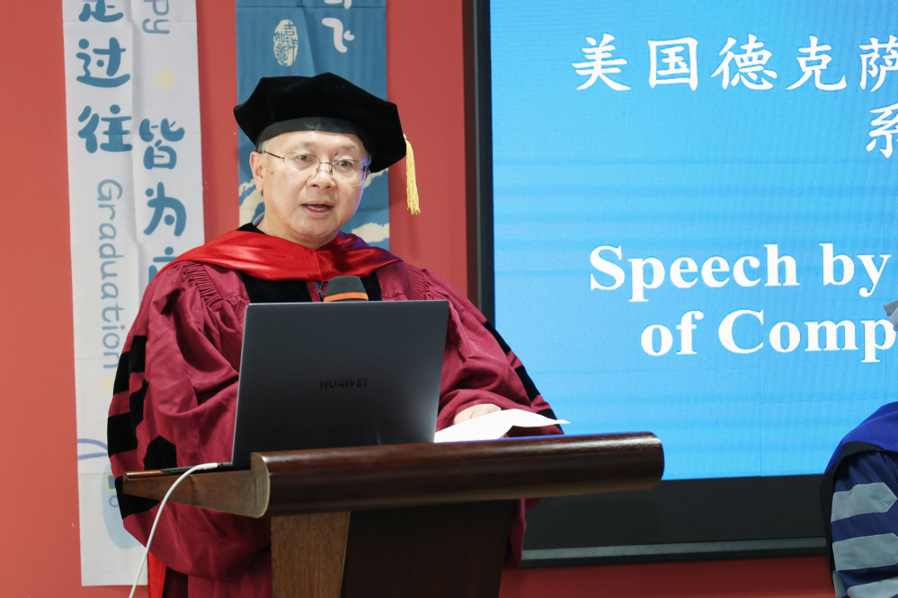 典礼上,Hong Jiang代表德克萨斯大学阿灵顿分校向2025届毕业生表示祝贺,并鼓励同学们带着项目赋予的技术知识和批判性思维,在未来的职业生涯中勇做技术变革的引领者,勇敢地站在时代前沿,不断探索未知领域,为行业发展注入新的活力。