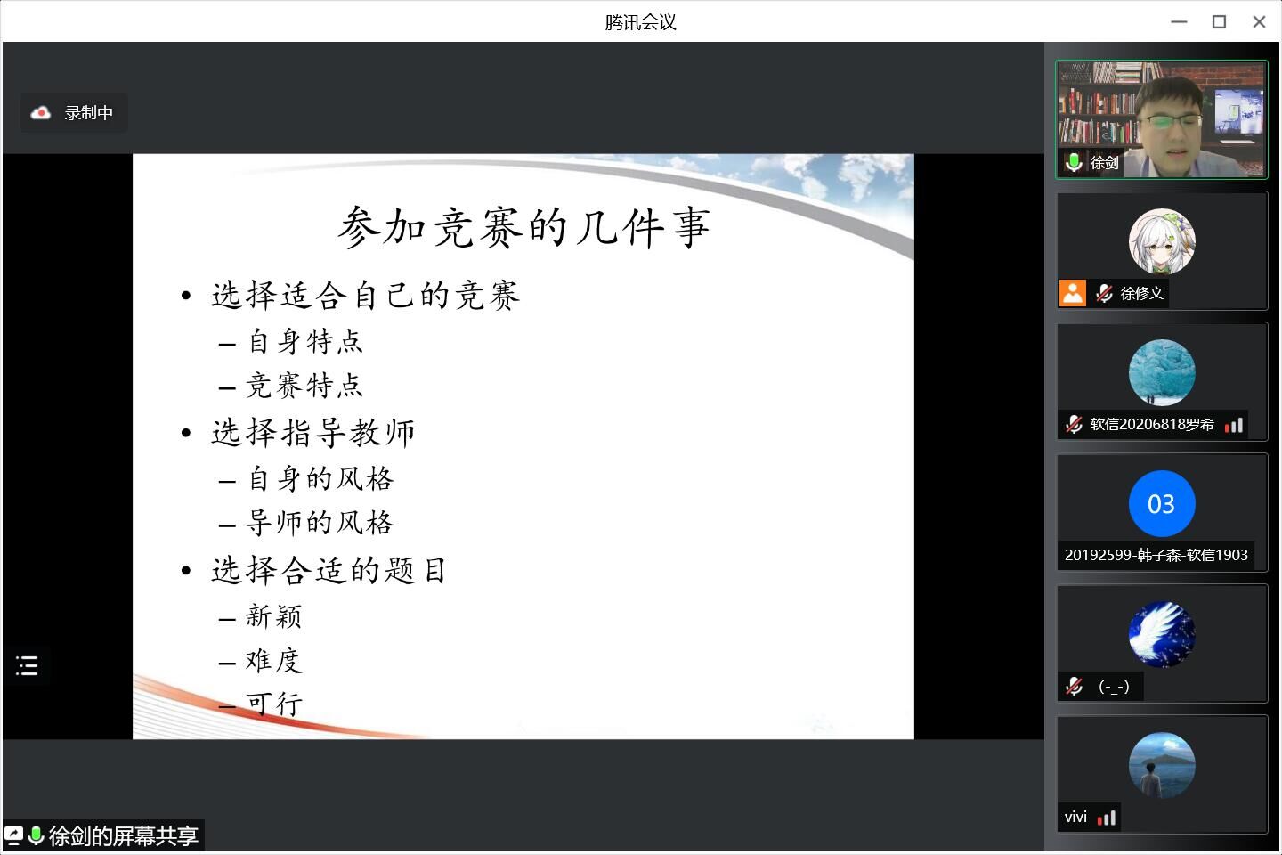 5月10日19时,金年会jinnianhuicom“精英讲堂·半月谈”活动通过腾讯会议举行。讲座以“从创新竞赛谈大学生的综合能力培养”为主题,活动邀请金年会jinnianhuicom信息安全系主任、党支部书记徐剑教授担任主讲嘉宾。各年级学生线上收看讲座。