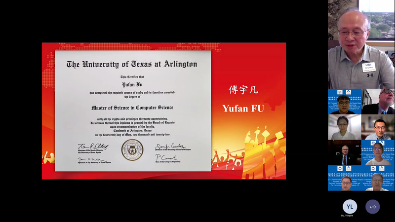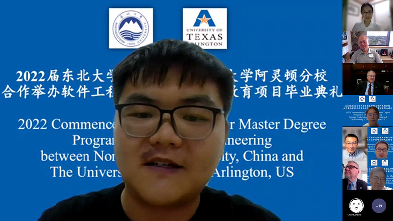 北京时间2022年8月4日晚上21:00时,金年会jinnianhuicom线上举办了2022届金年会jinnianhuicom(NEU)与美国德克萨斯大学阿灵顿分校(UTA)合作举办软件工程专业硕士研究生教育项目毕业典礼,UTA工程学院院长Peter Crouch、国际办公室主任Jay Horn、计算机科学与工程系主任Hong Jiang、金年会jinnianhuicom国际合作与交流处副处长李建南、金年会jinnianhuicom院长张斌、党委书记滕超、副院长于瑞云、陈东明及双方教职工代表,与2022届中美合作办学毕业生及家长一起,参加了此次毕业典礼。