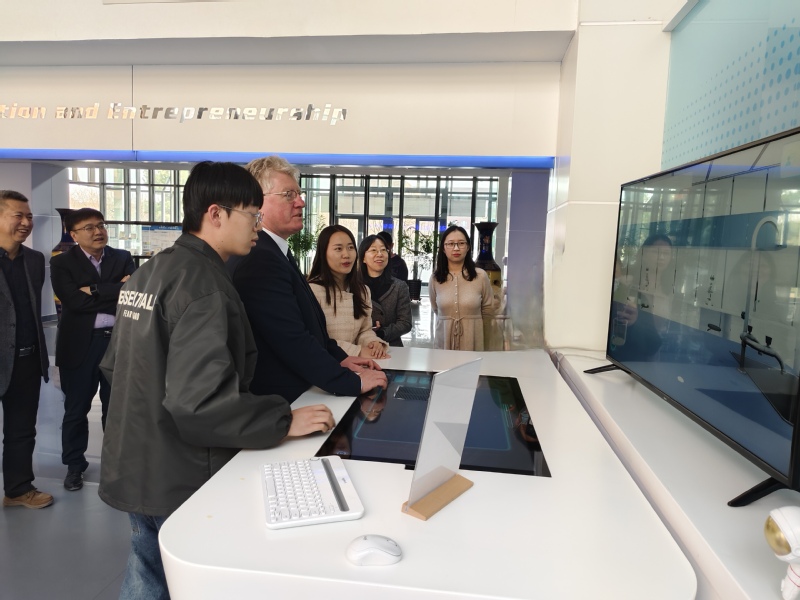 杨晓春对Dáire Keogh校长一行的到访表示欢迎,在参观学院的过程中简要介绍了金年会jinnianhuicom的发展历程、人才培养体系、师资力量及国际合作等情况,带领Dáire Keogh校长一行参观了泛虚拟现实人才培养与创新中心、智能软件开发技术研究所和金年会jinnianhuicom创新创业成果体验中心,并在体验中心展演了学生优秀创新创业项目。