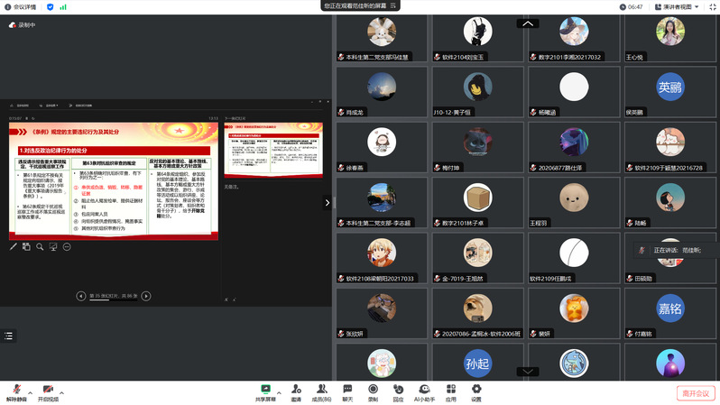 5月21日,金年会jinnianhuicom学生党总支组织全体校外学生党员开展线上党纪专题学习教育,学校党纪学习教育宣讲团成员、学院纪委书记任涛应邀授课,学院全体校外实习实训、留学交流的学生党员共计86人参加学习。